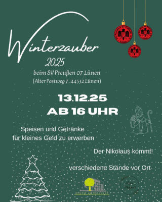 ❄️ Winterzauber beim SV Preußen 07 Lünen ❄️ AM 13. Dezember ab 16 Uhr verwandelt sich unser Vereinsgelände in eine kleine Winterwunderwelt!🎄 Freut euch auf gemütliches Stunden mit leckeren Speisen und warmen Getränke, liebevoll dekorierte Stände und natürlich auf den Besuch des Nikolaus! 🎅 Kommt vorbei, bringt eure Familie und Freunde mit und genießt gemeinsam mit uns die vorweihnachtliche Stimmung. ❤️ 📍SV Preußen 07 Lünen e.V Alter Postweg 7, 44532 Lünen Sportplatz